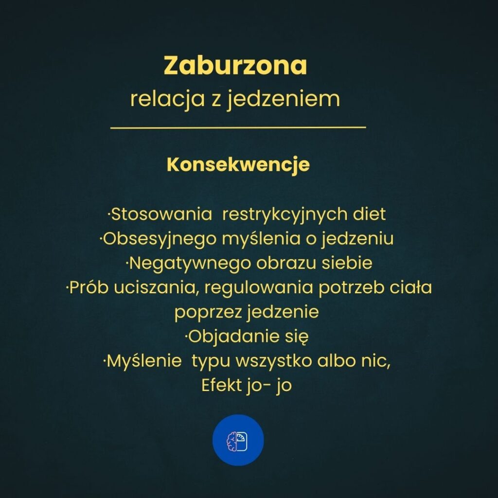 Przy zaburzonej relacji z jedzeniem ignorujesz  sygnały ze swojego ciała, walczysz z nim stosując diety cud, które sprawiają, że nie czujesz się dobrze.  Reagujesz tak, jakby zachcianka oznaczała, że MUSZISZ TO ZJEŚĆ. Ulegasz swoim  zachciankom. Nie umiesz, umiejętnie zaopiekować się swoimi potrzebami. Nie jest to przyjemna relacja.